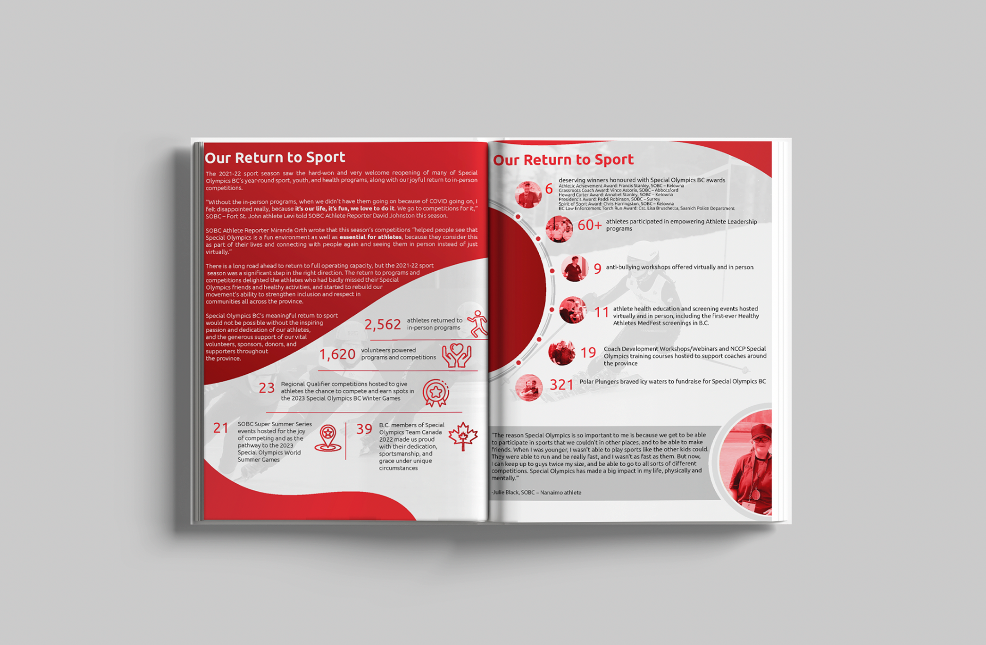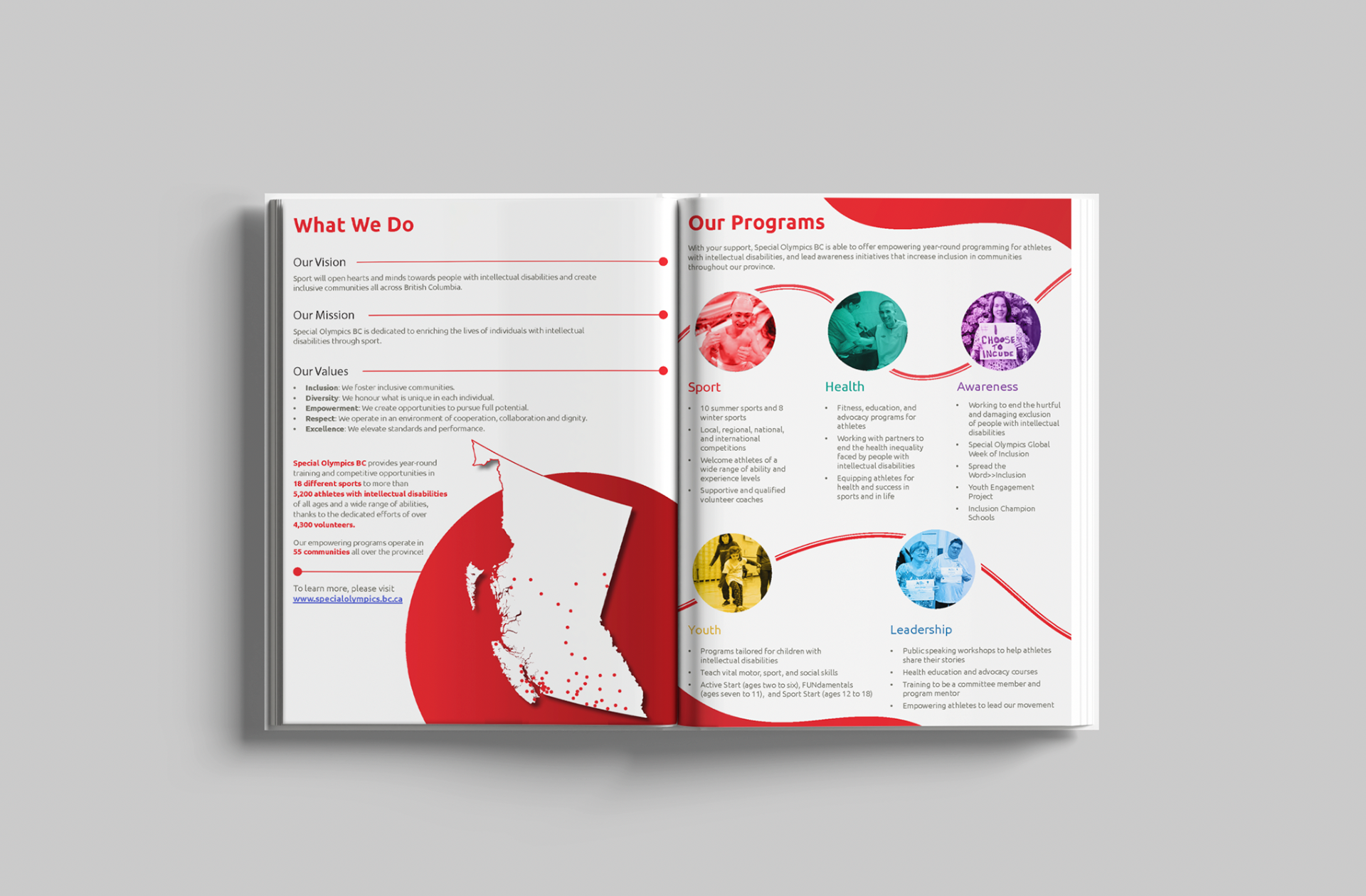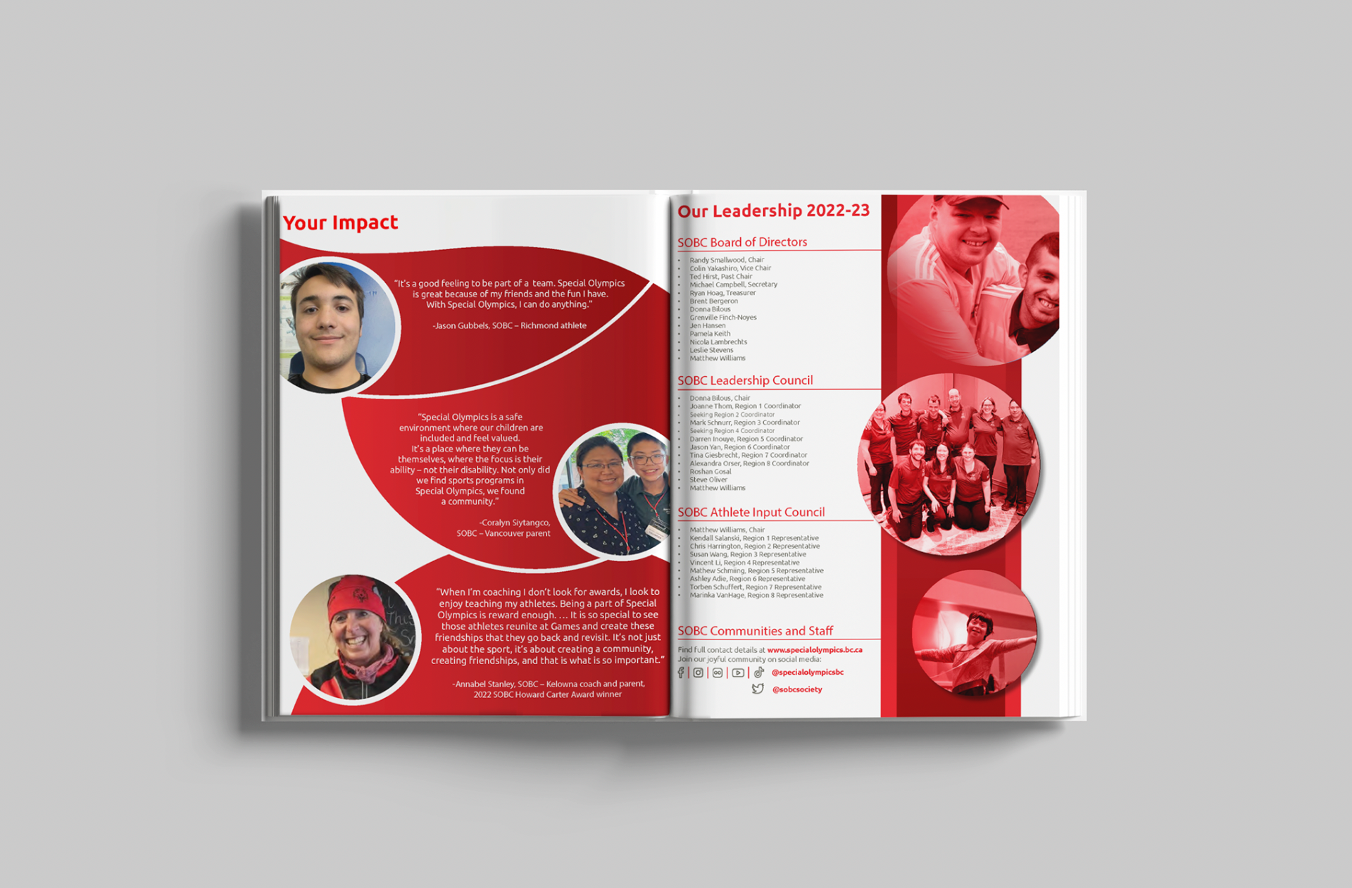 I designed and produced the full annual Impact Report for Special Olympics BC, transforming large amounts of text, statistics, and stories into a clear, professional, and visually engaging publication. My focus was on creating a structured layout that communicated impact data effectively while maintaining a polished and accessible design. This project required balancing visual creativity with precision, ensuring consistency across pages and making the report easy to navigate for a wide audience.